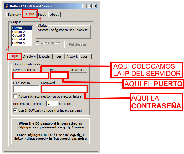5- Versión del servidor SHOUTcast (V1 o V2)